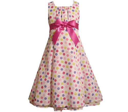 Beautiful WHITE & FUCHSIA-PINK MULTI DOT EYELET dress features sleeveless SHIRRED/GATHERED BODICE with square-neckline and FUCHSIA-PINK SATIN RIBBON & CENTER BOW TRIM at the EMPIRE WAIST. Fully lined EYELET EMBROIDERED SKIRT features PINK-PURPLE-LIME-GREEN-DOT PRINT with attached ruffle crinoline underskirt for added fullness and backzip closure with BOW TIE SASH IN BACK for perfect fit. Machine washable. Imported. Of polyester/cotton - Lining of polyester/cotton/nylon - Exclusive of trim/decoration. Matching/Coordinating sister sizes available in 12M-Girl PLUS Size, search for style(s): BNJ-6695R. More girl PLUS SIZE party dresses available, search for: " bnj-girl-party-dress "