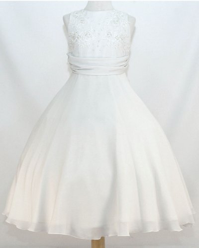 White Georgette Communion Dress with Lace Sheer Covered and Corsage Waist Back, Zipper Close Back